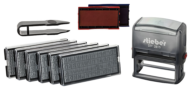 stieber® Stempel zum Selbersetzen, 5 Zeilen: 6 Typensätze, 2 Kissen, Stempelunterlage