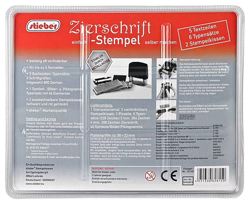 stieber ® Stempel zum Selbersetzen 2812, 5 Zeilen: 6 Typensätze, 2 Kissen, Stempelunterlage