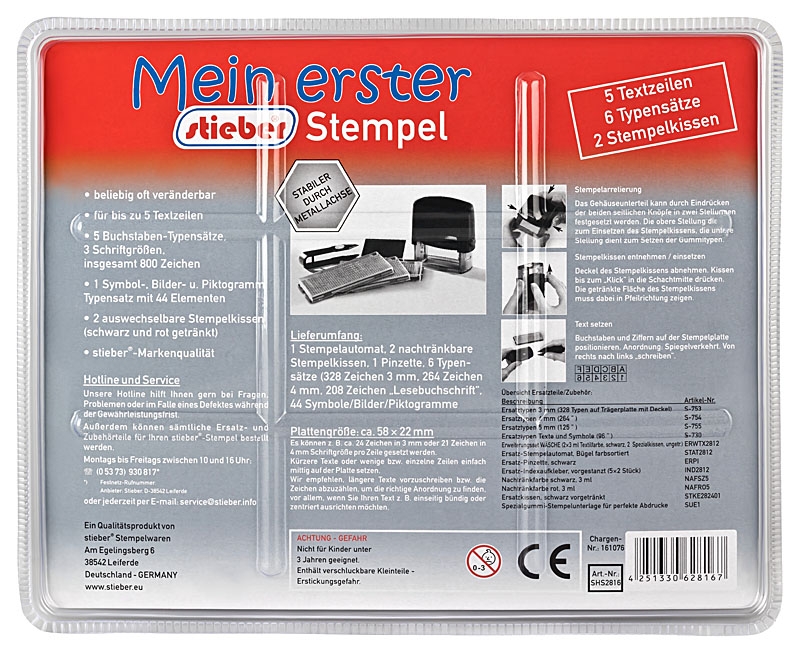 stieber® "Mein erster"-Stempelset zum Selbersetzen, 5 Zeilen: 6 Typensätze, 2 Kissen, Stempelunterlage