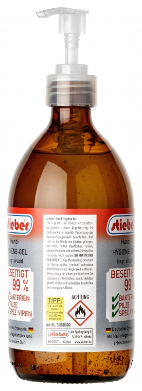 Das Hand-Hygiene-Gel von stieber® ist optimal geeignet, um die Hände hygienisch sauber zu reinigen, es wird ohne Wasser und Seife angewendet. Begrenzt viruzid "plus" sowie antibakteriell ist das Wirkspektrum besonders breit und zuverlässig eingestellt. Es verleiht ein frisches, gepflegtes Hautgefühl durch den wissenschaftlich bestätigten Hautpflegekomplex, der spezielle mild rückfettende, schützende Inhaltsstoffe, u. a. Aloe-Vera-Extrakt und Antioxidantien, enthält. Dadurch ist der extrem hohe Alkoholgehalt gut hautverträglich. ANWENDUNG: Mindestens 2 ml in den Handflächen, sowie auf den Fingern, insbesondere den Fingerkuppen, bis zum Trocknen verreiben (ca. 30 Sekunden). WICHTIG ZU BEACHTEN: Nur bei Bedarf, nicht öfter als fünf Mal täglich anwenden. Nicht zur chirurgischen Händedesinfektion geeignet.