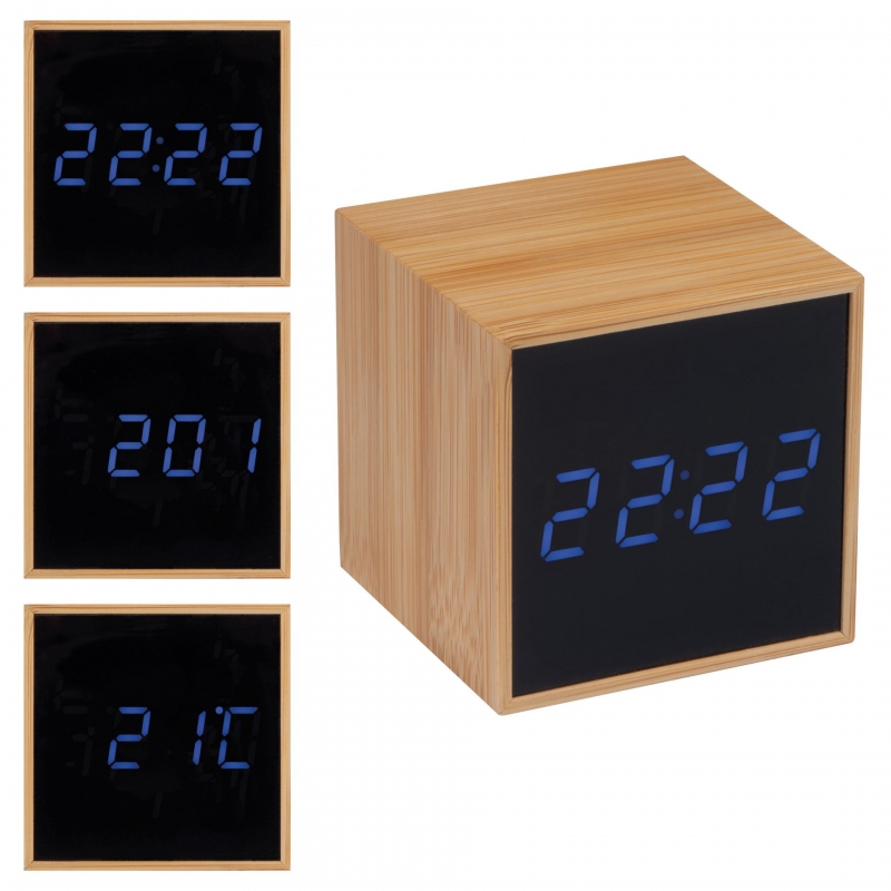 Nur ca. 6x6x6 cm ist dieser elegante Würfel aus Bambusholz groß, der eine kleine technische Raffinesse verbirgt: Hinter dem schwarzen Displayfeld wird eine blaue LED-Anzeige erzeugt, die abwechselnd die Uhrzeit, die Temperatur und das Datum anzeigt. Zur Stromversorgung dienen Batterien (3 Stk. Standardgröße AAA, nicht enthalten) oder wahlweise ein normaler USB-Anschluss. Ein Netzteil, das auch als Ladegerät für z. B. Handies verwendet werden kann, und Kabel liefern wir gleich mit!